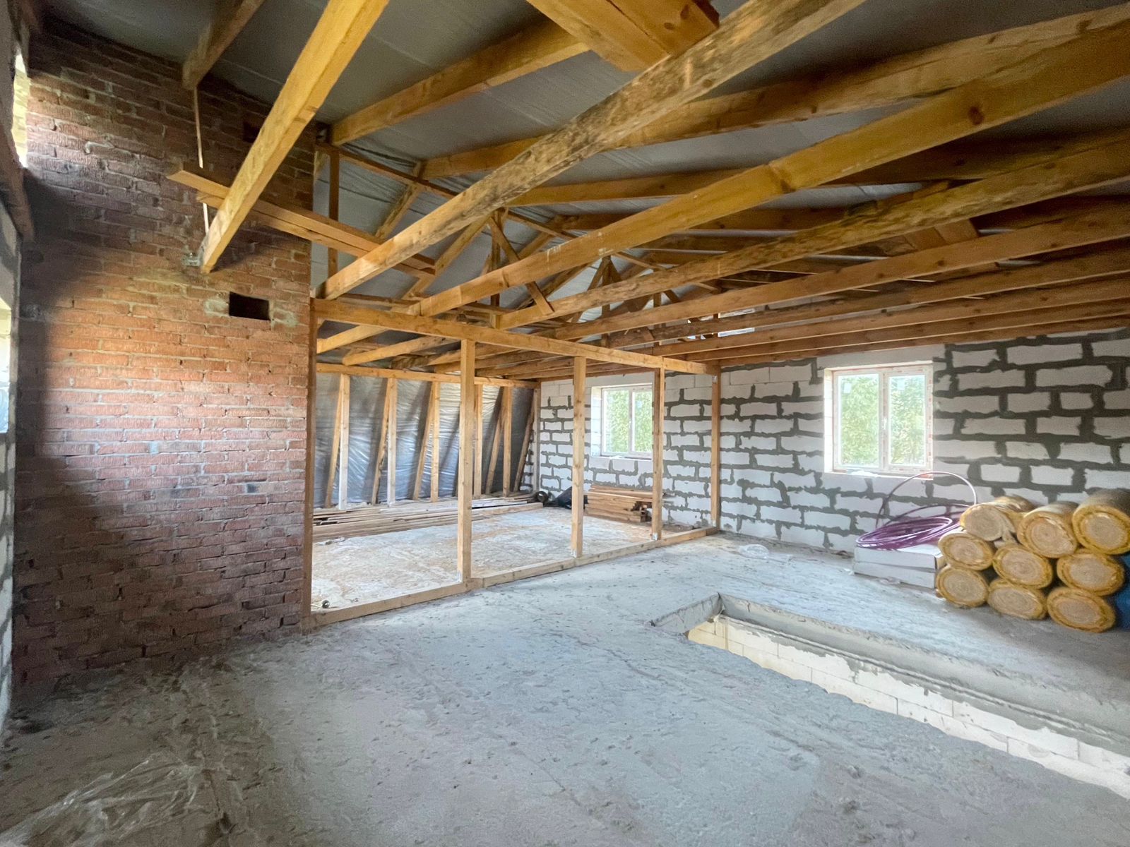 На втором этаже находится одна большая мансардная комната, поделенная на две зоны.